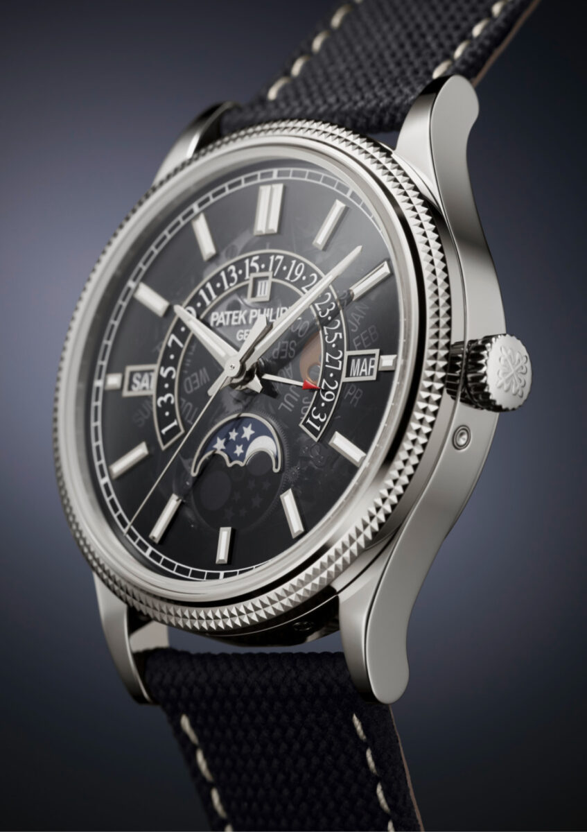 這是一款整體美感令人驚豔的作品,以一種優雅內斂的頻率,展現具原創性的現代風格。百達翡麗藉由灰色金屬鍍噴處理再加上黑色漸變邊緣,為此錶款打造出沈穩優雅而富神祕美感的灰色煙燻色調藍寶石錶盤,既能展示出26-330 S QR自動上鍊機芯,又可保有易讀性。上一款採用相同錶盤設計的作品是2023年發表的5316/50P,此錶款採鉑金打造,集結三問、萬年曆與陀飛輪等複雜功能,藉由這種若隱若現的視覺美感,令藏家可以欣賞到內部機芯結構的錯綜複雜。