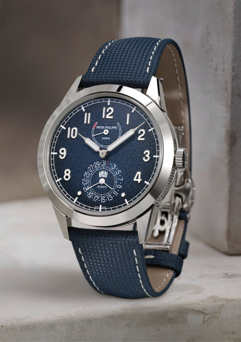 百達翡麗近年逐步發展出一套獨到的設計美學,將優雅與運動風格和諧融和出新穎的現代美感,全新亮相的Calatrava八日動力儲存腕錶白金款5328G-001即是展現這種風格的例子之一,在Calatrava系列的雅緻基因中融入運動風格,錶徑41mm的圓形錶殼採白金打造,錶殼外緣裝飾巴黎釘紋圖案,搭配藍色漸層粒紋面盤。設置在6時位置的視窗式瞬跳星期顯示與指針式瞬跳日期顯示是錶盤上的技術亮點;這項配置十分新穎,星期和日期顯示於午夜瞬間跳轉,兩項功能整合在同一個小錶盤,藉此維持Calatrava腕錶一貫的簡潔特色。