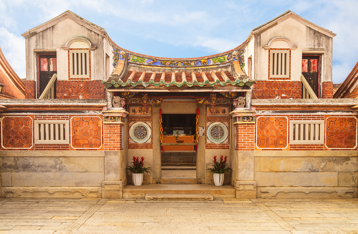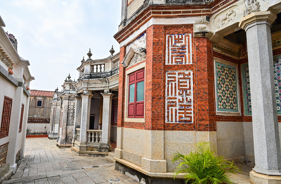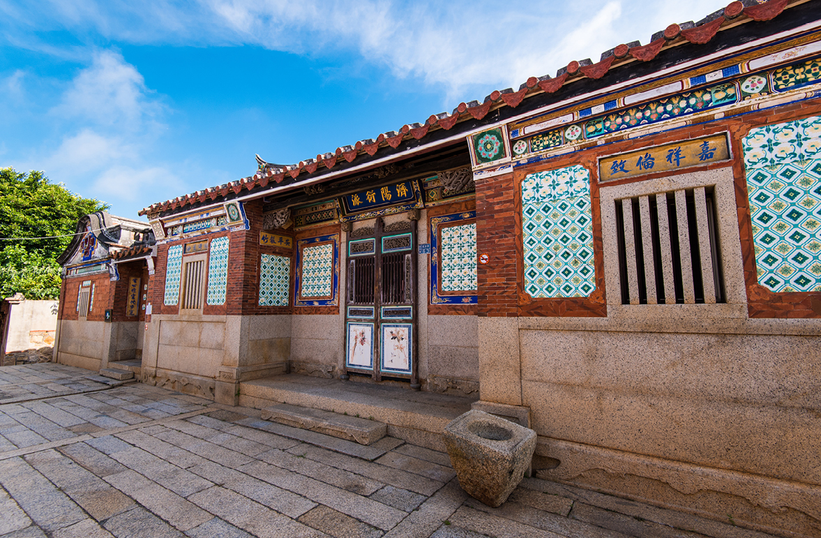 水頭過去是相當富有的聚落,保存有金門最多且最精美的閩式建築與洋樓,走訪其中,可以在建築的屋脊、脊墜、外牆、大廳、門廊⋯⋯發現花磚的蹤跡,除了吉慶紋樣之外,由時還能看見印度象、南洋人像等罕見圖案。當地最美的花磚古厝中,被暱稱為「金門花磚博物館」的黃天露宅,是一棟結合傳統閩式二落大厝與西式疊樓而成的建築,落成於1930年,正面壁堵上色澤豔麗的彩磚精緻繁複,為樸質的建築增添迷人風韻。